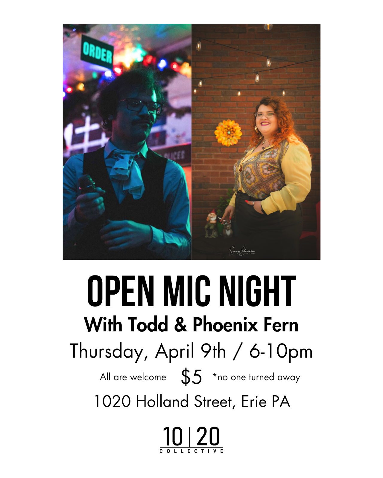 Back to All Events Open Mic Thursday, April 9, 2026 6:00 PM 10:00 PM The 1020 Collective 1020 Holland Street Erie, PA, 16501 United States (map) Google Calendar ICS